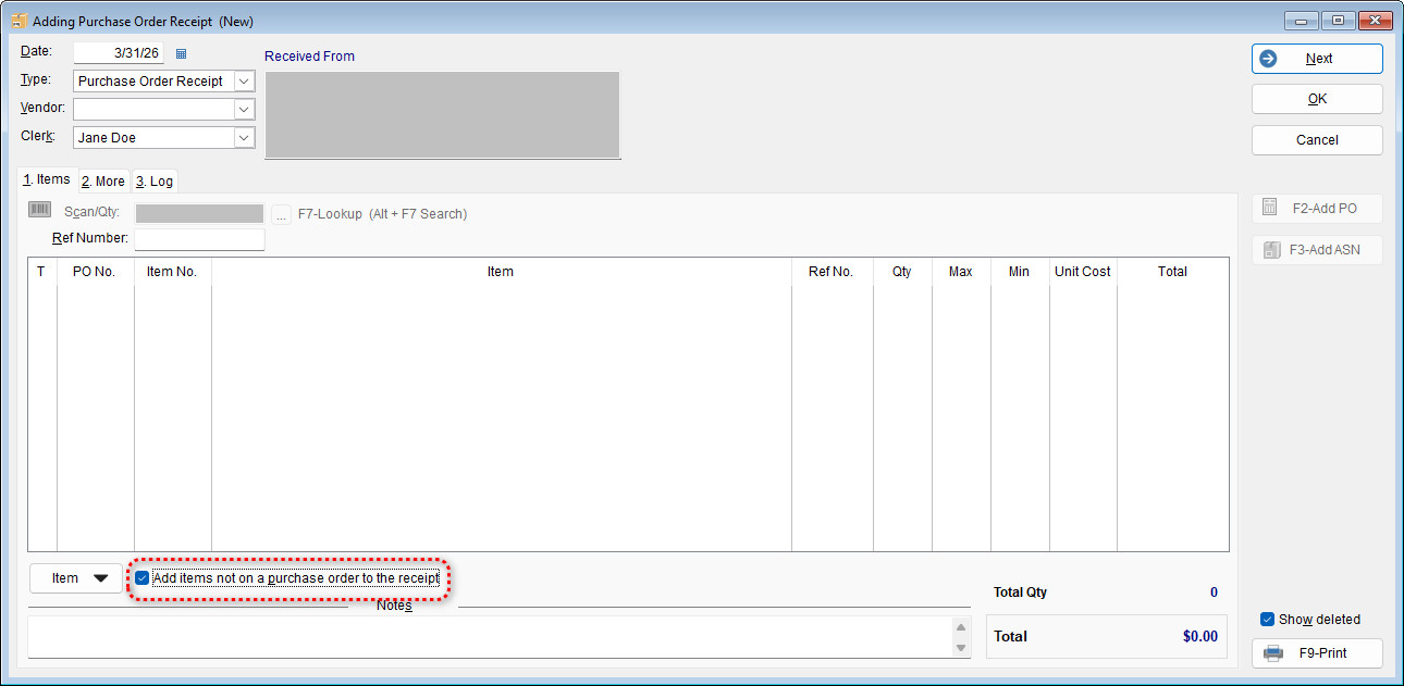 In the newly opened receiving List, check the box that’s says “Add Items not on a purchase order to the receipt”