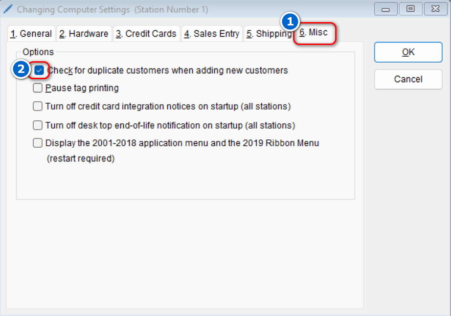 - Select the Misc tab >Â Select the “Check for duplicate customers when adding new customers” option