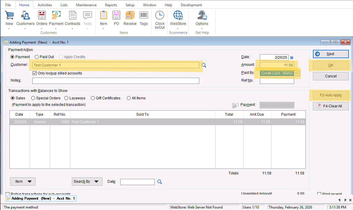 - Once open you will add the customer name in the “Customer field” which will populate the invoice, add the payment total in the “Amount” field and change the “Paid By” to the Unattached CC method (Credit Card- Manual). Once you have updated all that information you can select “F2-Auto Apply” to apply the payment to the invoice. Select “OK” and save the invoice to complete the transaction.