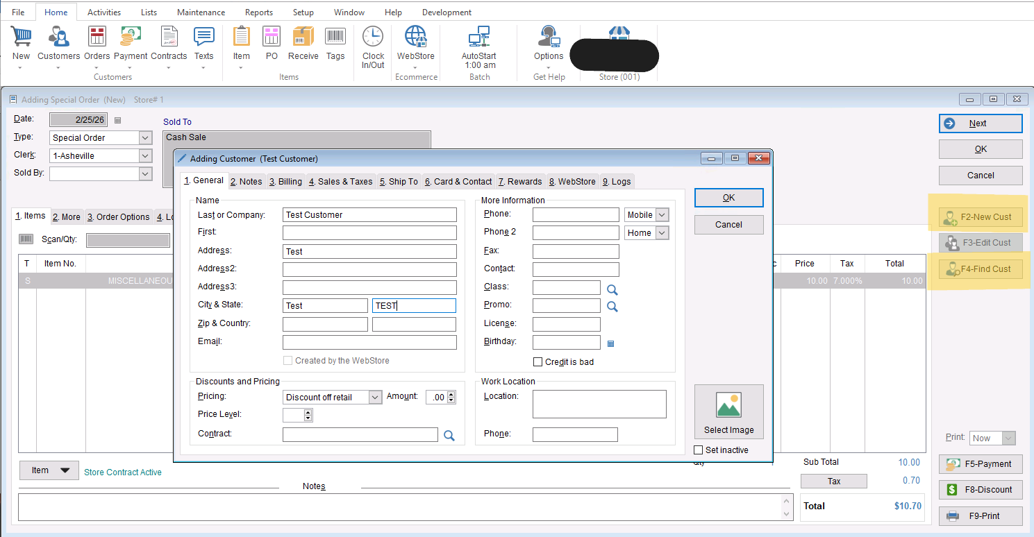 - Once you have your invoice created you will need to add our customer to the sale. you can either choose “F2-New Cust” or “F4- Find Cust” to add them in. Regardless of which one you choose its important you go into the “3.Billing tab” of the customer record to add “Allow Sales on Account” to be able to bill this invoice.