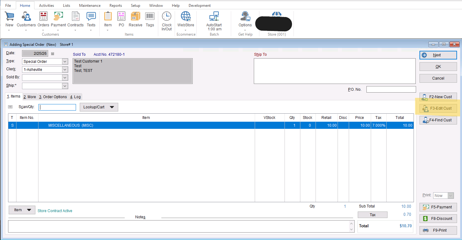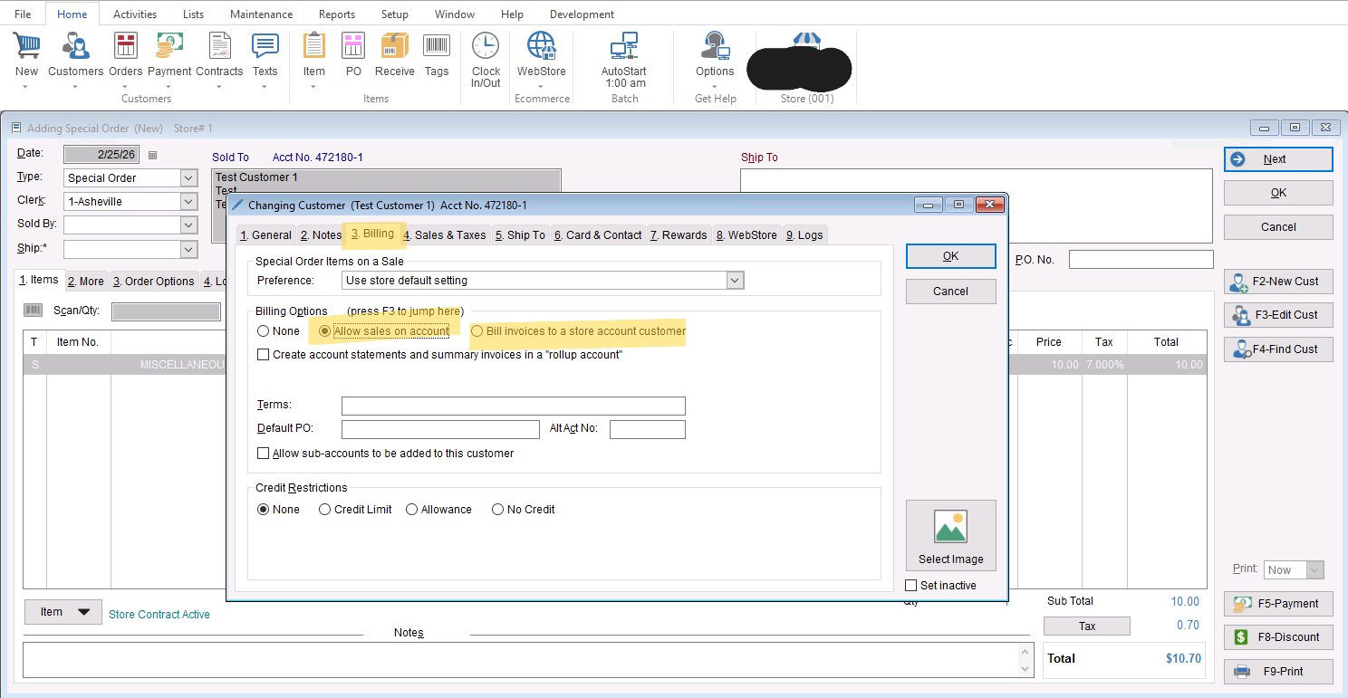 - Regardless of which one you choose it’s important you go to “F3- Edit Cust” and choose the “3.Billing” tab of the customer record to add “Allow Sales on Account” to be able to bill this invoice.