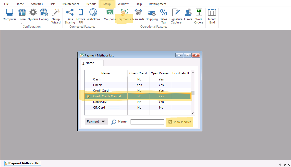 - Now that you have your invoice created and saved you can start the process to apply a unattached payment to the invoice. To start the process you will first need to make sure our unattached CC payment method is active, normally this would be saved as “Credit Card- Manual” it is generally set to inactive so you will need to activate it before use. You can do this by going to “Setup>Payments” and selecting the “Show Inactive” checkbox to show the payment method.
