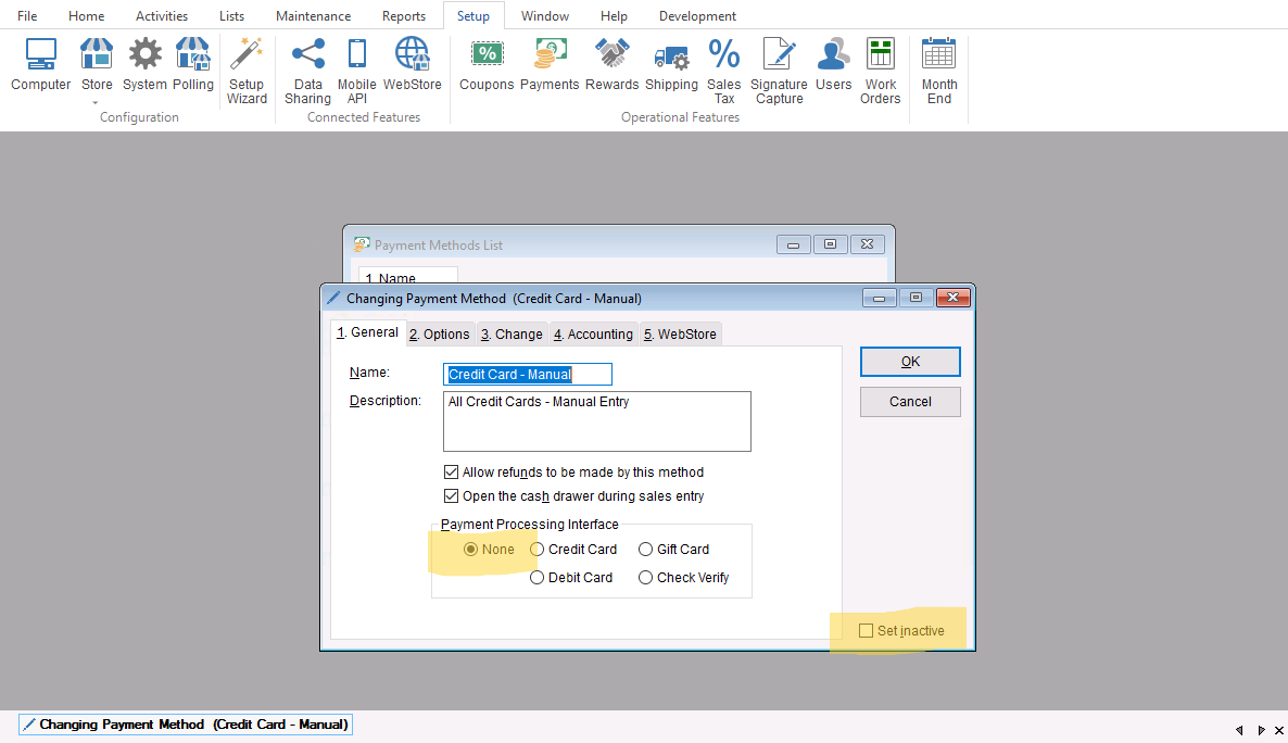 - Now that you have located your payment method you will need to set it to active so it can be used when you go to apply the payment to our invoice. You will want to double click and open the record and make sure that the “Payment Processing Interface” is set to “None” and the “Set Inactive” checkbox is unselected.
