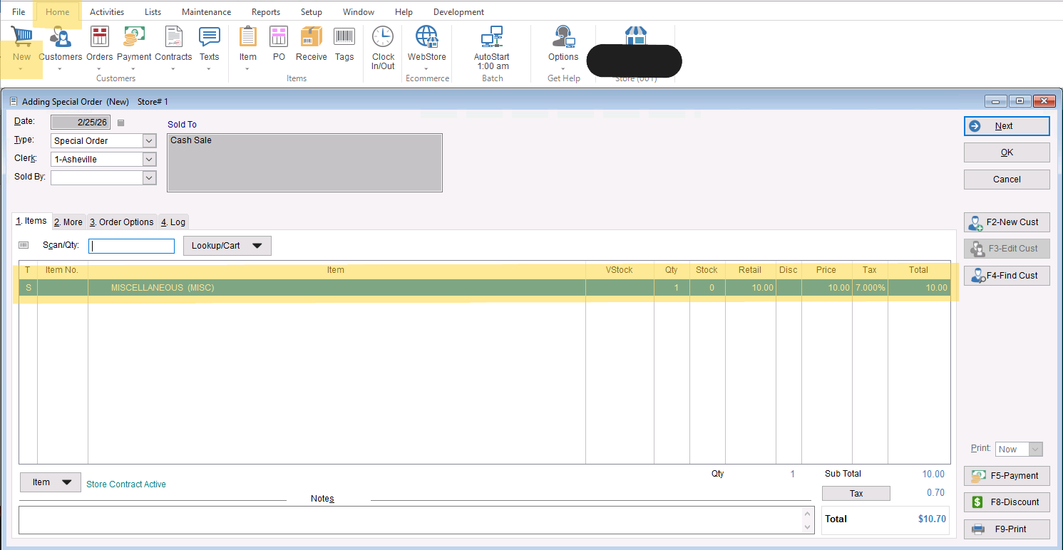- To start the creation of a manual invoice, you are going to go to Home>New to start a new sale. Here, you will add any items you need to add to the sale, along with discounts or tax changes, and add the customer record associated with the sale.