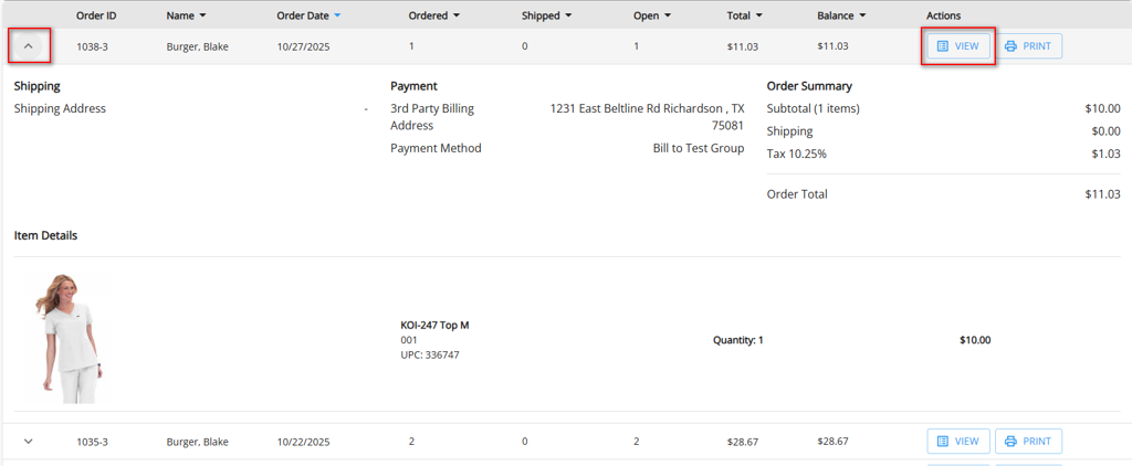 To view orders, click the arrow on the left to expand the order details. For a full-page view, select the View button under Actions.