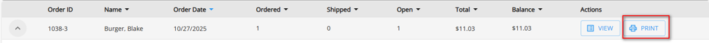 To print an order, select “Print” under Actions or from the order details page. A PDF will be generated with the order details for printing.