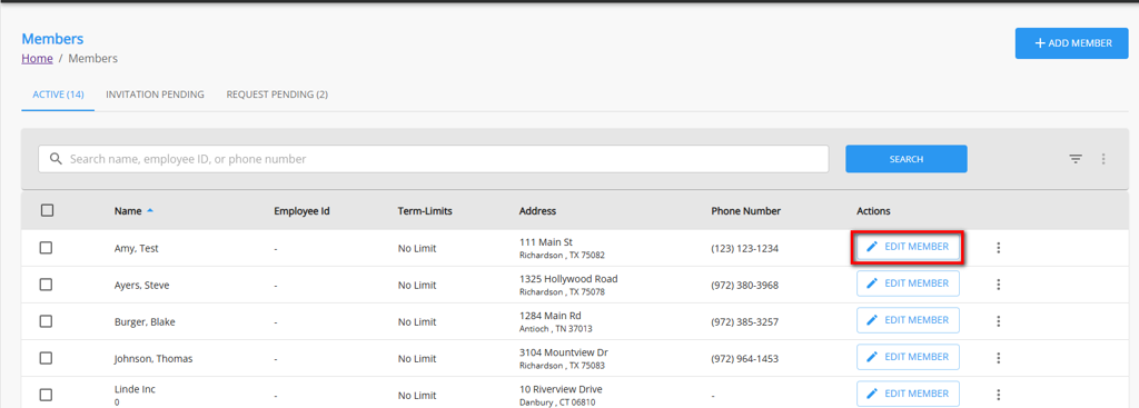 To edit a single member, click the “Edit Member” button next to their name. The admin can update certain member details; however, fields such as Login Email cannot be edited.