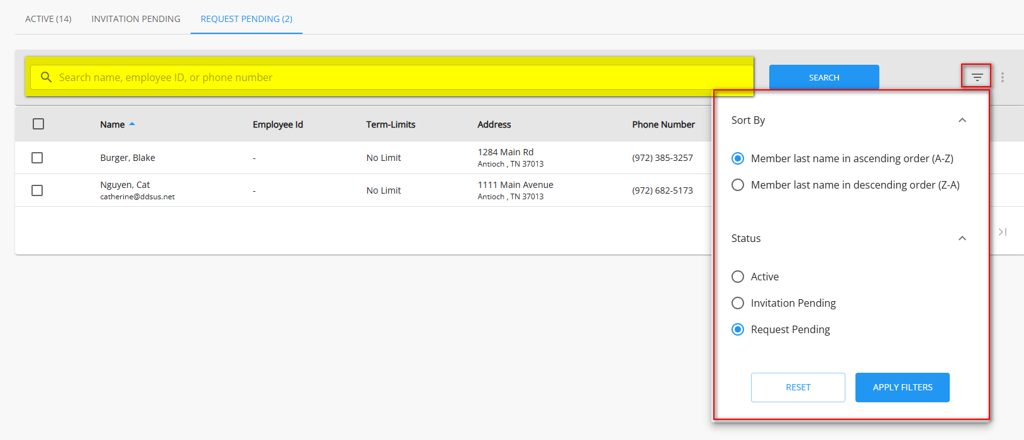 You can easily search by a member’s name, employee ID, or phone number. To sort the member list, click the filter icon on the right and choose your preferred sorting options.