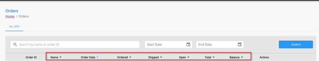 Use the column headers to sort orders in ascending or descending order by Name, Order Date, Ordered, Shipped, Open, Total, or Balance.