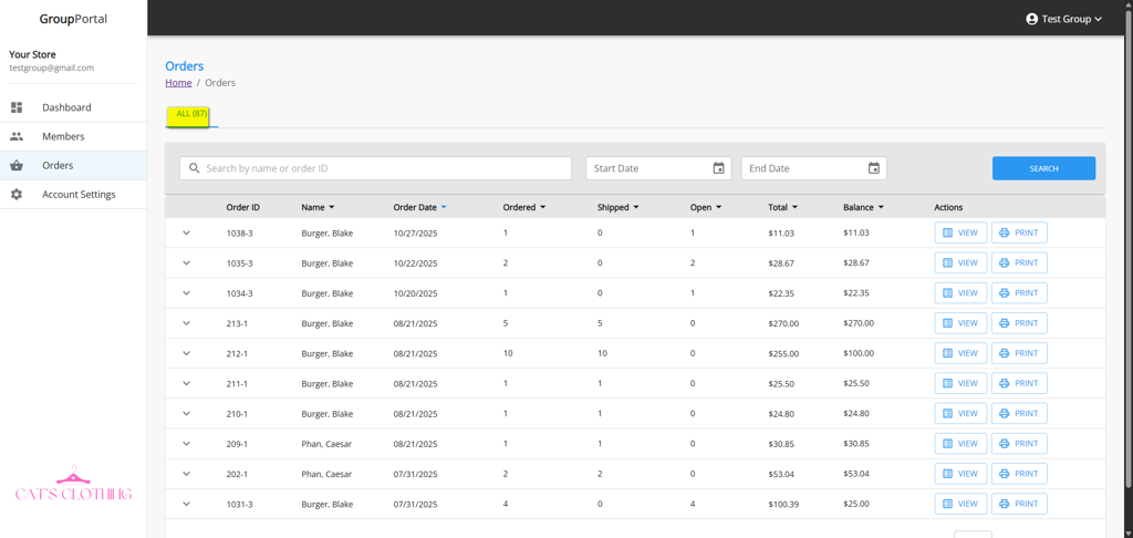 The Orders section allows you to access group order history, view detailed order information, and print invoices as needed. The tab at the top displays the total number of orders placed within the group. Use the search and date filters to locate specific orders.