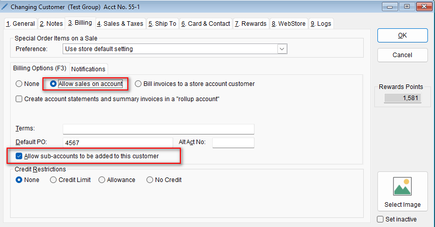 Open the Customer record and select the Billing tab to confirm that “Allow sub-accounts to be added to this customer” is checked.