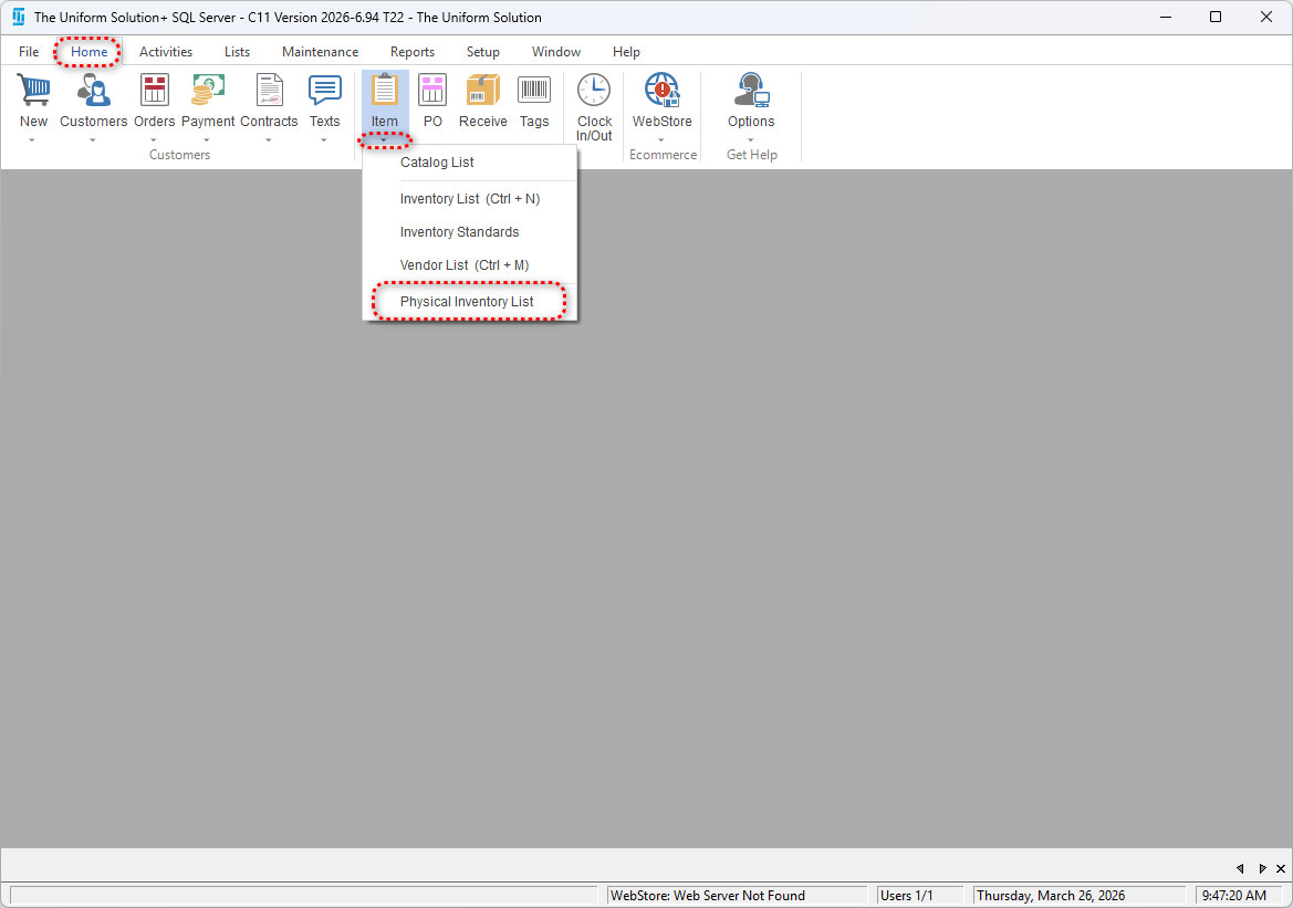 - Go to Home > Items (drop‑down menu) > Physical Inventory List.