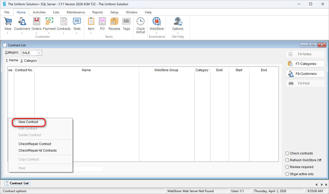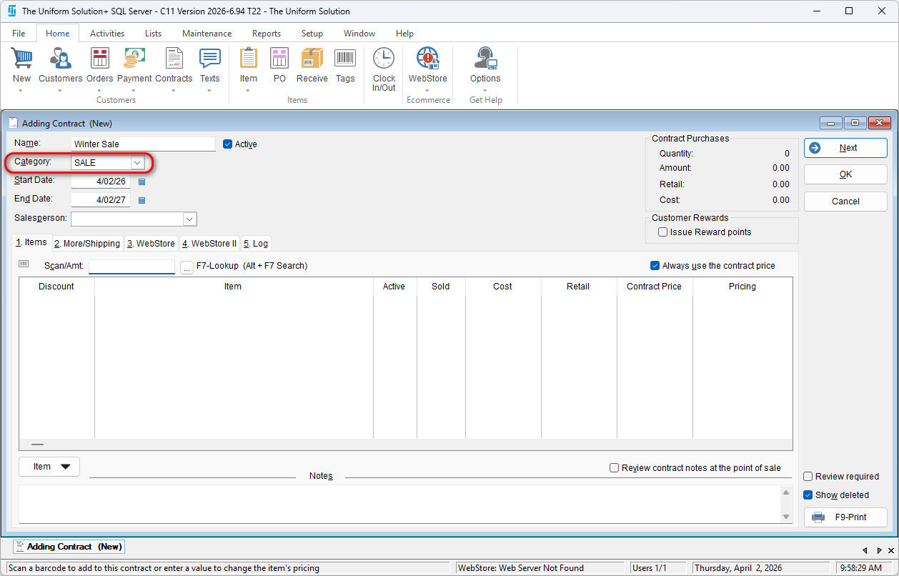 Name the Contract, and select the desired Category (or create a new one such as SALE).