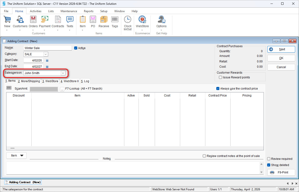 Once the changes are saved – you will now see the contract set to active on all sales and will automatically see the price be discounted for the items added onto the contract.