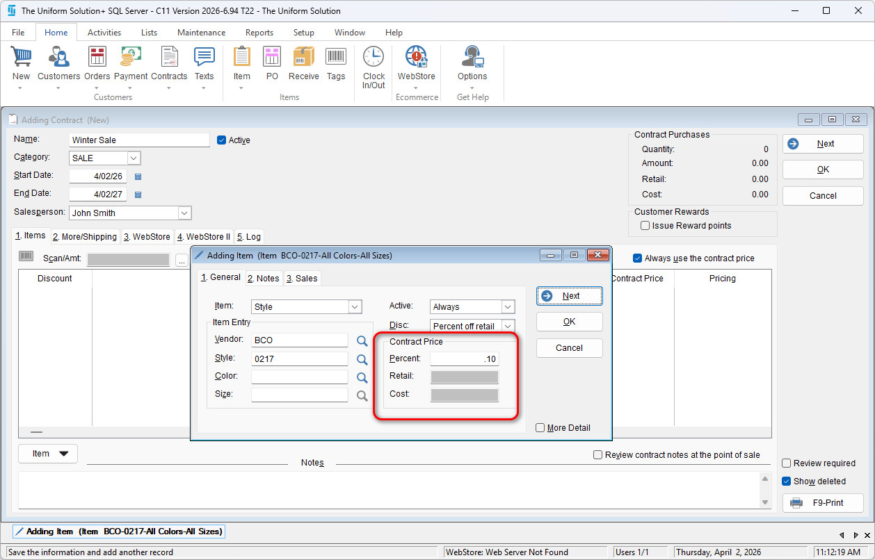 Running an in‑store sale is an effective way to move aging inventory and attract customers. This process uses Contracts to define discounted items and a Store Configuration setting to automatically apply those discounts at the point of sale.