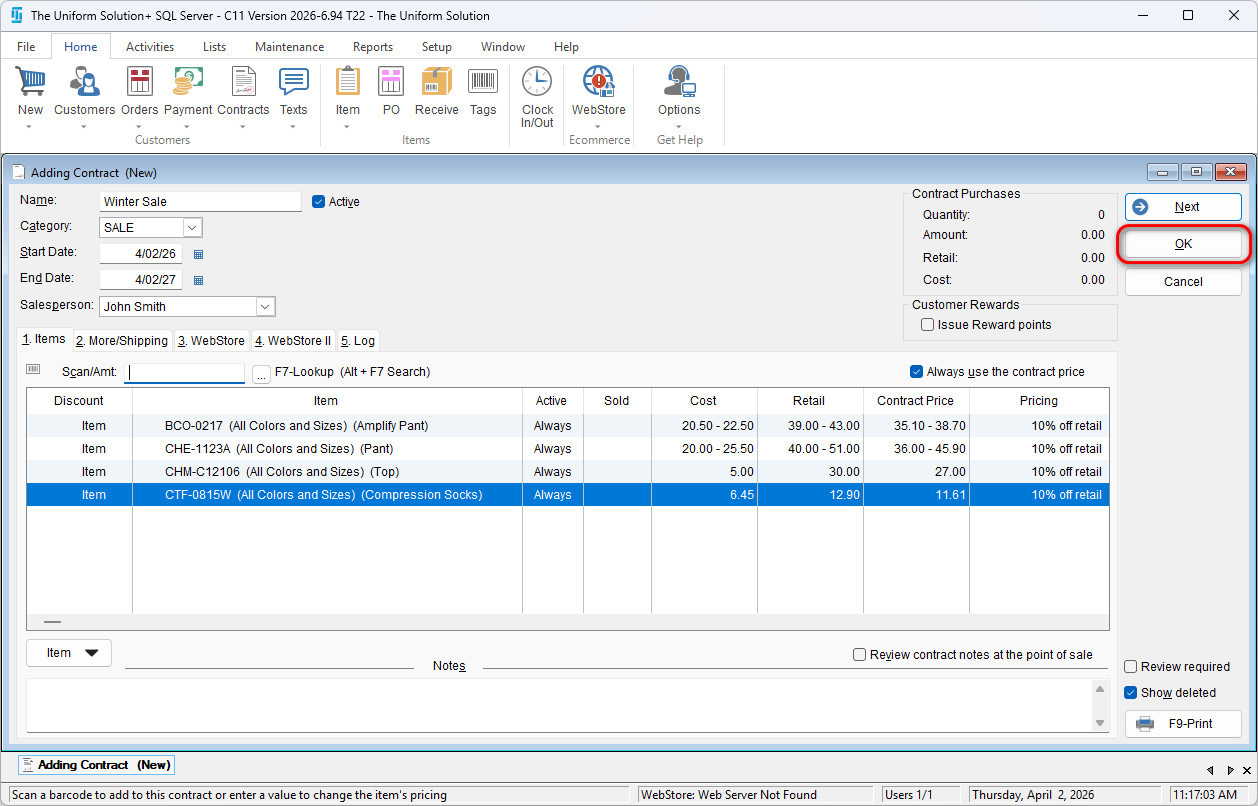 Once all of the desired items have been added to the contract, select OK to save the contract.