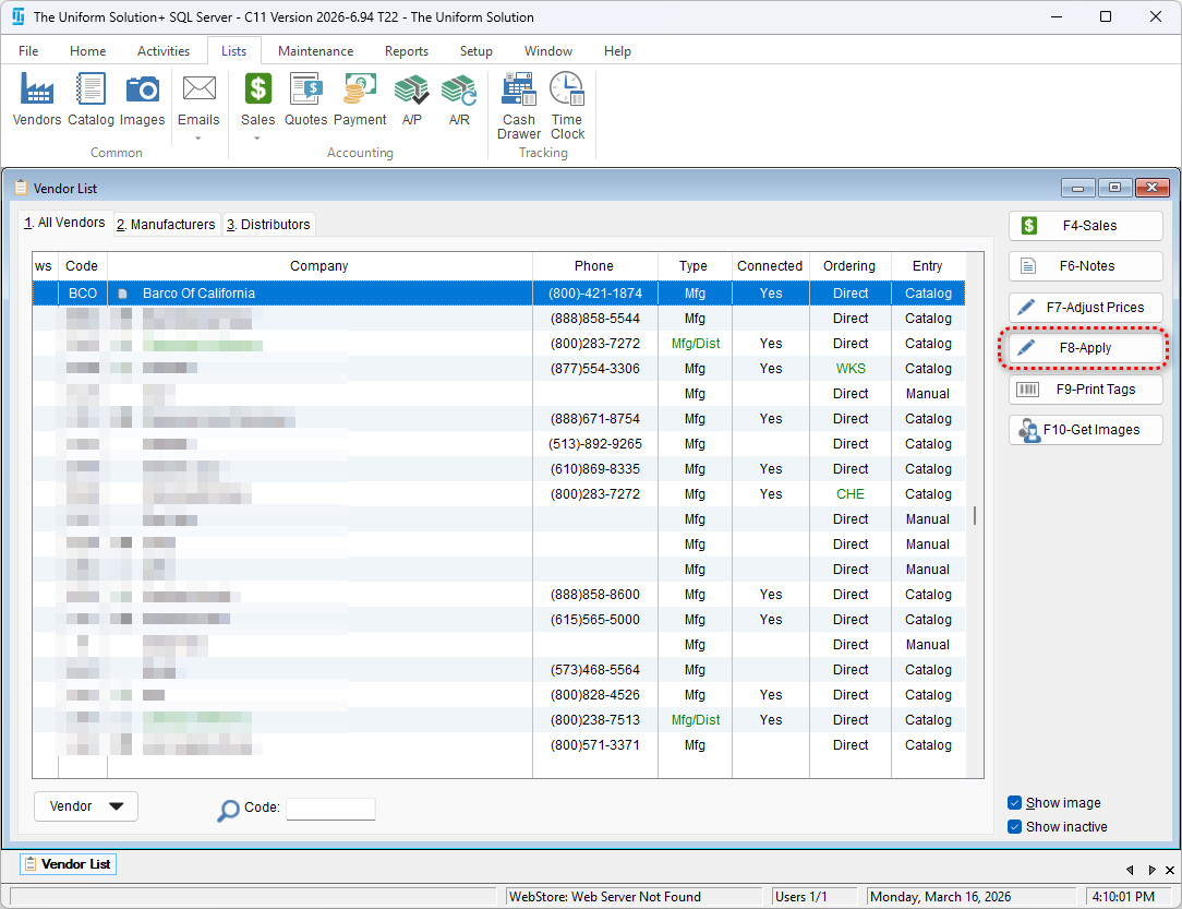 - Select Apply to apply your new vendor options