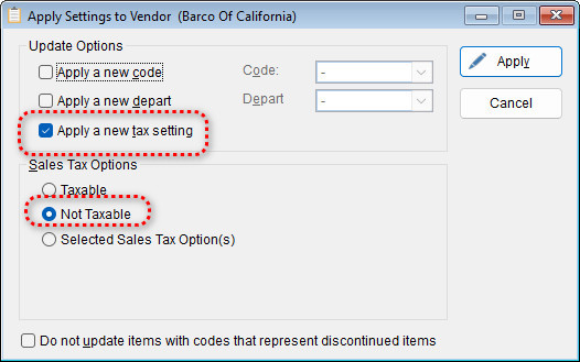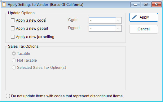 When you need to quickly apply a new setting—such as a code, department, or tax option—to all items associated with a vendor, you can do so directly from the Vendor List. This process allows for efficient bulk updates without modifying each item individually.