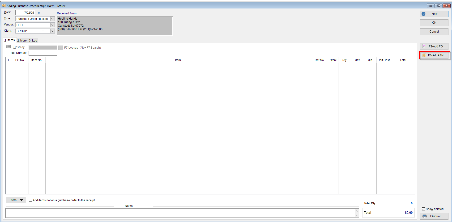 • If another purchase order needs to be added to the purchase order receipt, select F2-Add PO and complete the process again.