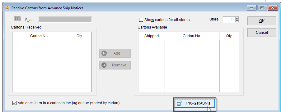 • Once ASNs are generated, you will either scan the ASN on the box or highlight the ASN from the list and hit the Add button.