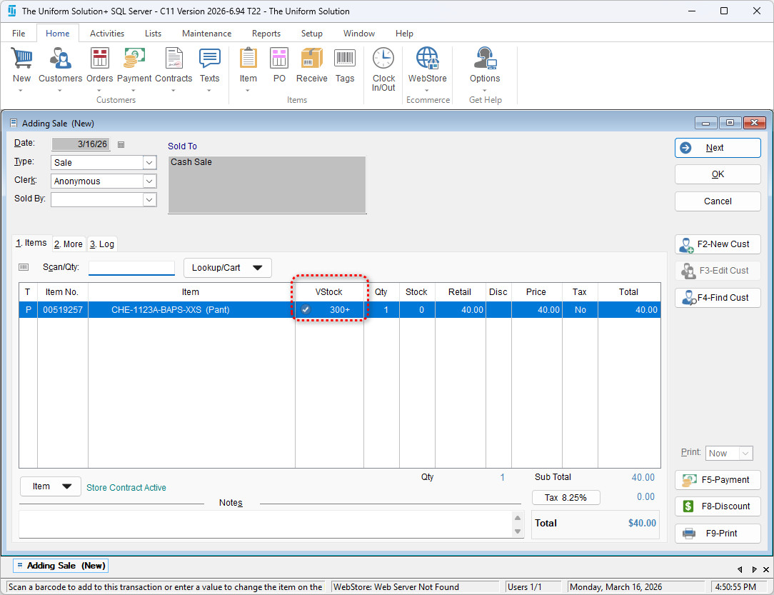 • Select the Items tab to return to the sale and once you scan in an item – it will show the Vendor Stock level in the new VStock Tab.