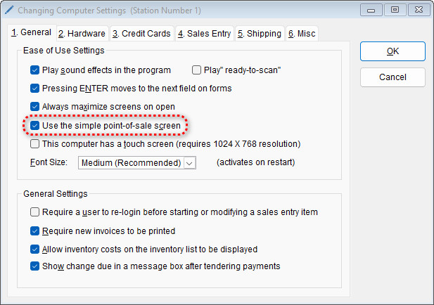 - On the General tab, check the Use the simple point-of-sale screen option