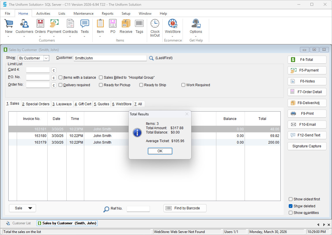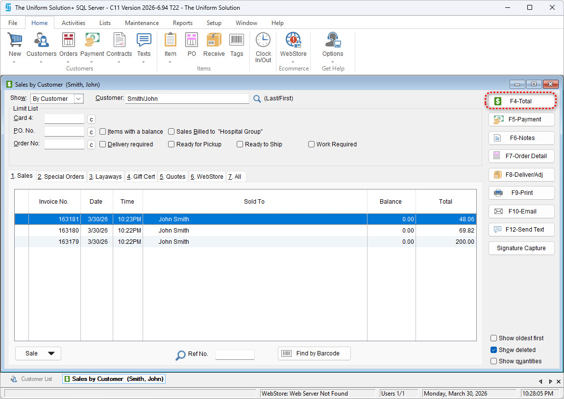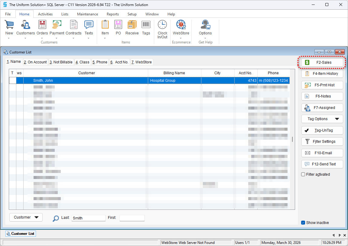Highlight the desired customer, then select F2 – Sales to open that customer’s complete sales history.