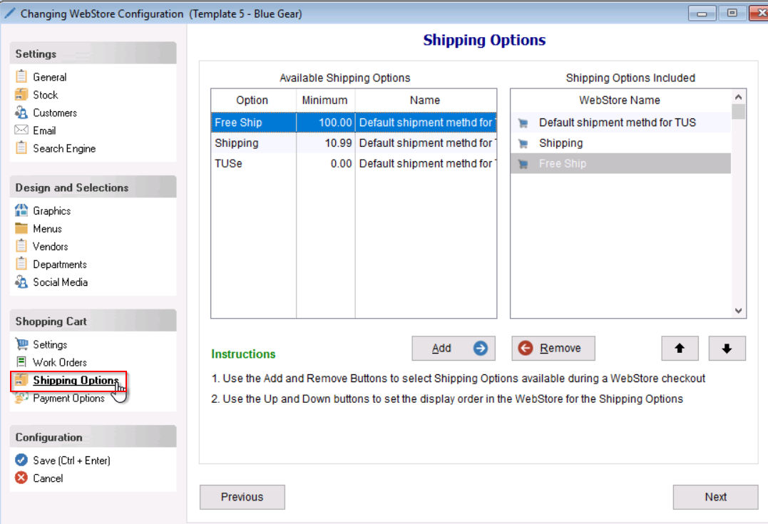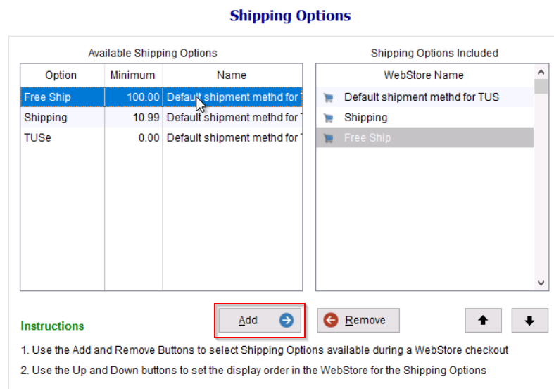 The selected shipping option(s) will move to the right panel, making them visible and selectable on the WebStore.