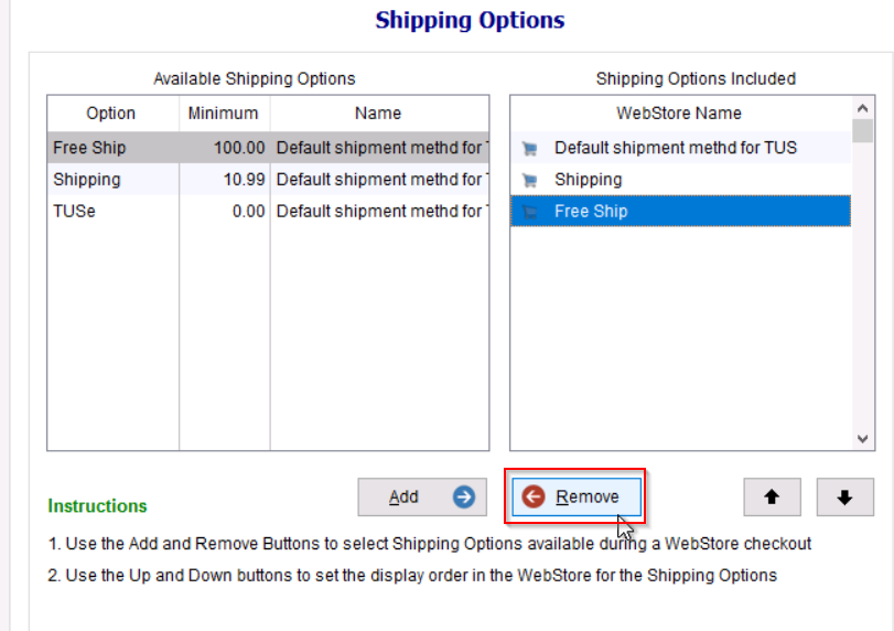 The selected shipping options(s) will be moved back to the left panel and will no longer be accessible from the WebStore.